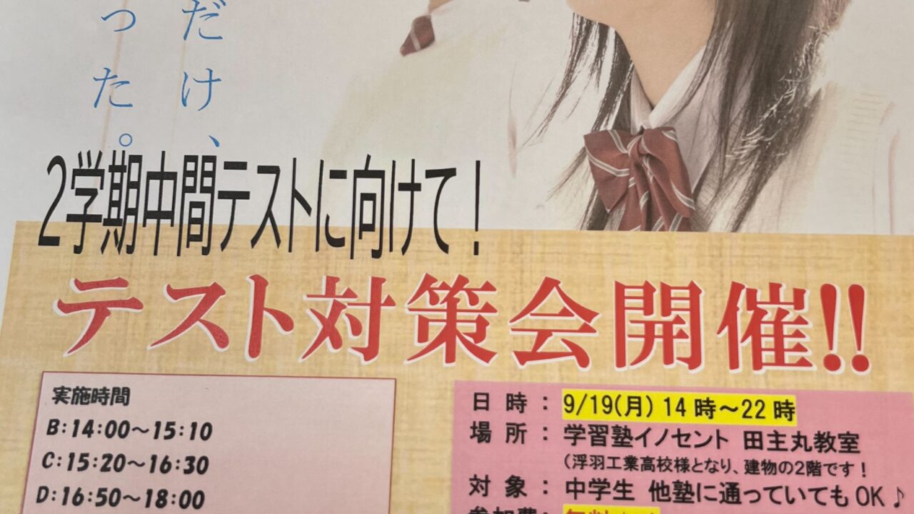 田主丸中学校のみなさんは9月22日、吉井中学校のみなさんは9月21日、比良松中学校や浮羽中学校のみなさんは10月初旬に中間テストが実施されます。