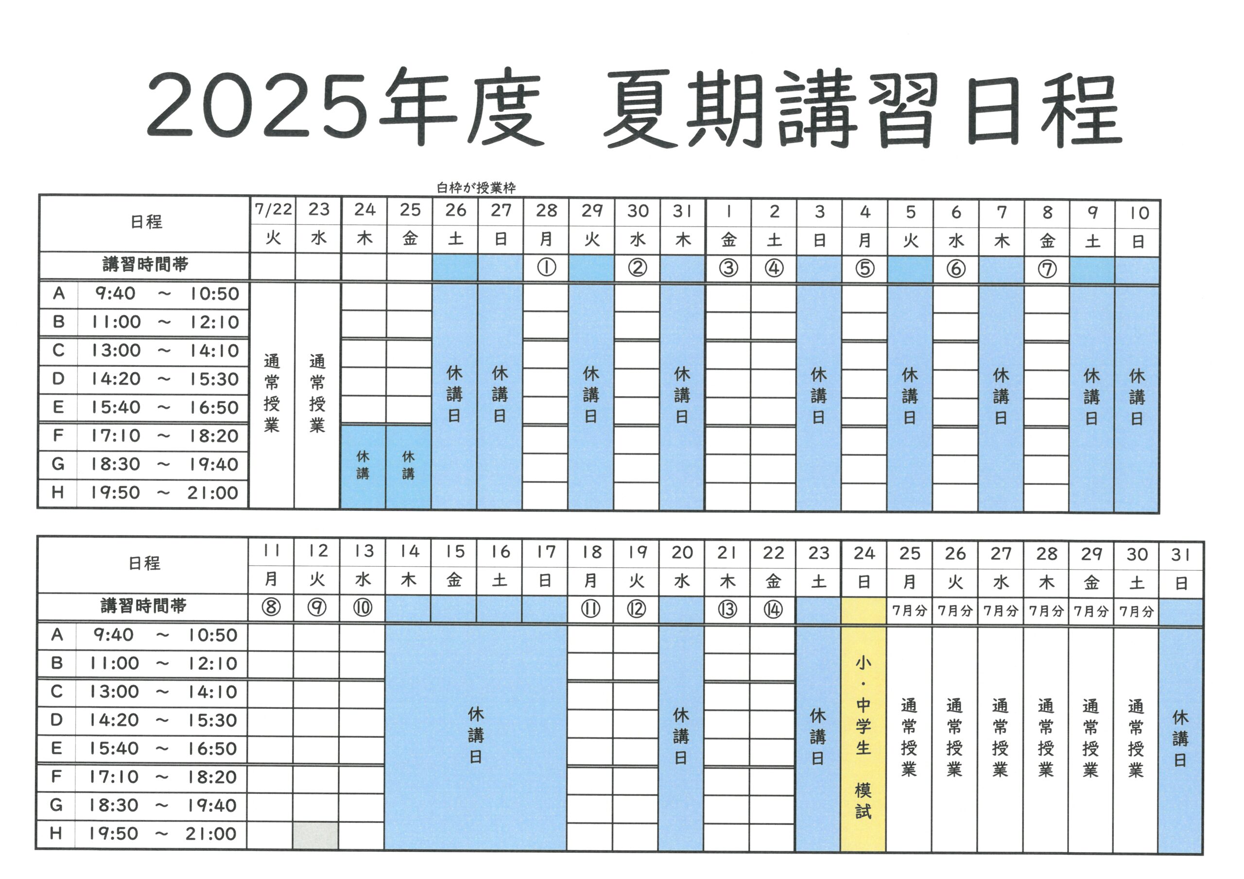 夏期講習、今年の日程は下記のとおりです!
