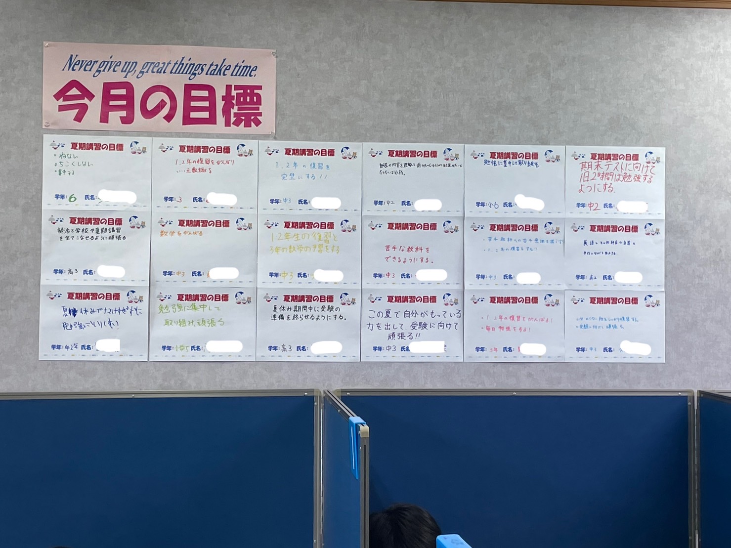 何か一つでも「これだけは誰にも負けないくらい勉強した!」「テストで満点取れて自信がついた!」と実感できるように、生徒それぞれに夏の目標を考えてもらいました。
