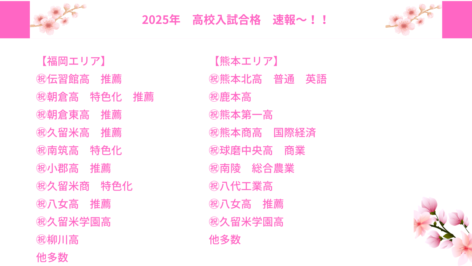 このたび久留米中央教室は、移転リニューアル・オープンしました。小・中・高の全学年に対応した「受験に超絶強い‼」個別指導塾として、さらなる飛躍を目指します。
