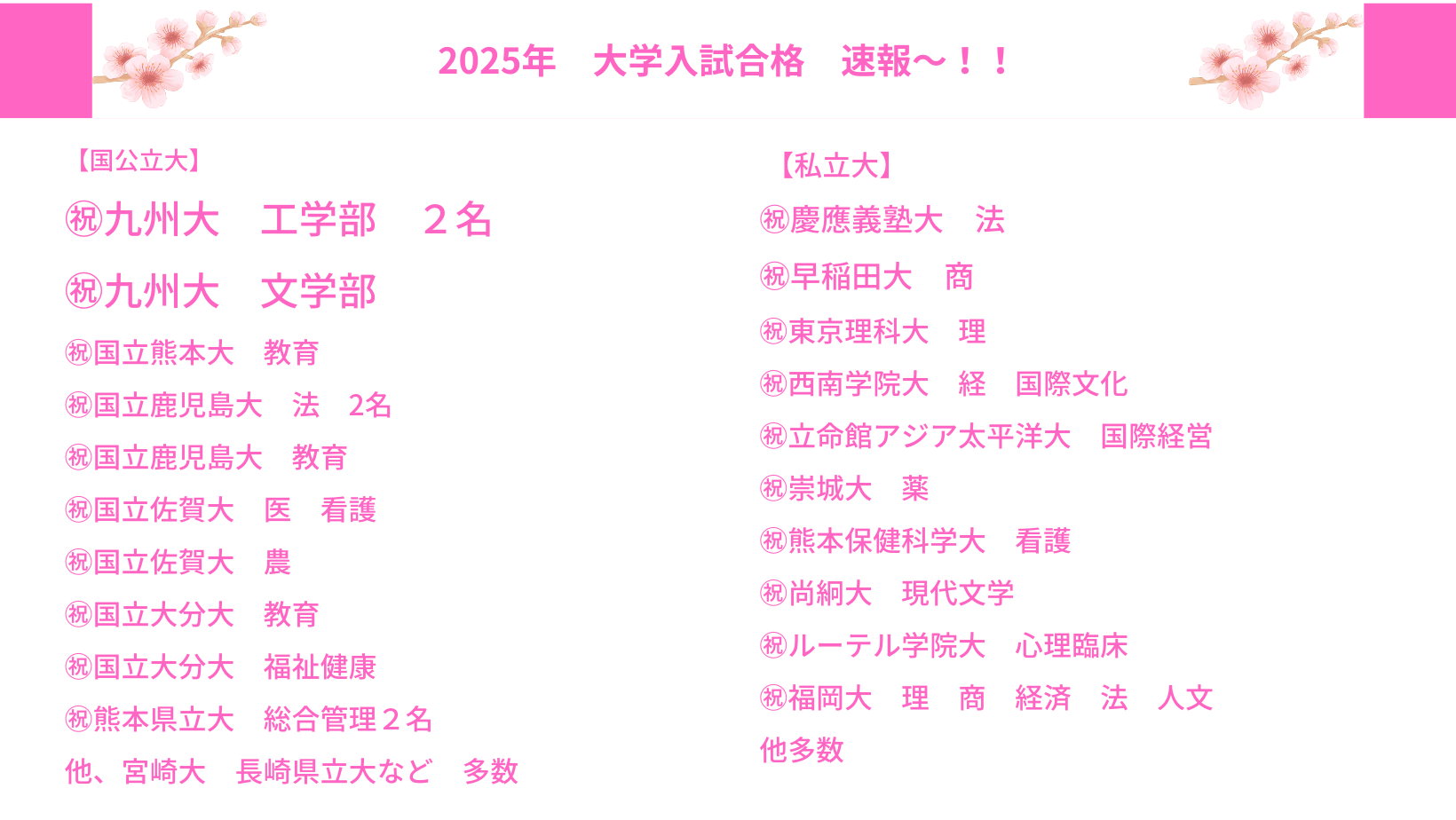 <近隣対象校>北野小・弓削小・大城小・宮ノ陣小・味坂小・御原小・大刀洗小・金島小・付属小・北野中・大刀洗中・宝城中・宮ノ陣中・小郡中・久留米信愛中・付属中・朝倉高・久留米高専・有明高専・小郡高・朝倉東高・三井中央高・久留米高・明善高・南筑高・久留米信愛高・筑水高・三井高・常葉高・筑陽学園高・筑紫台高