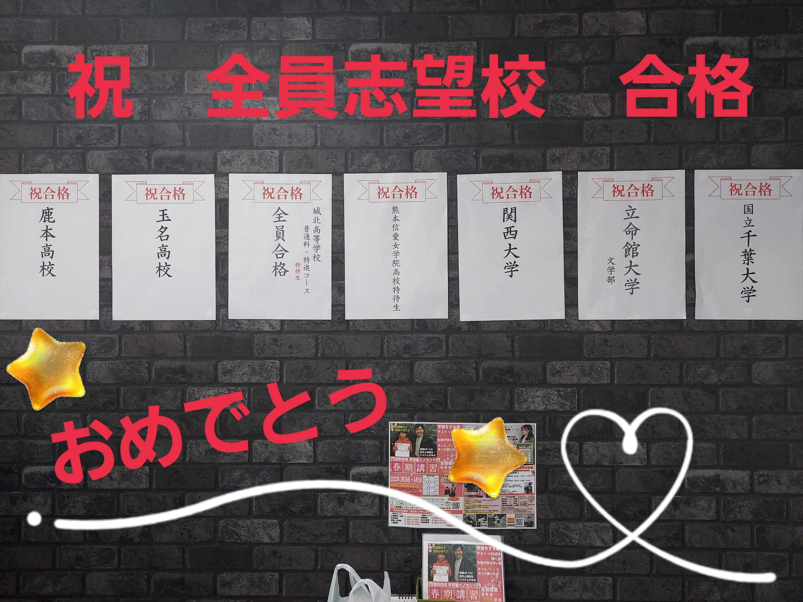 山鹿教室 ★祝★合格(*^^)v 山鹿教室 事務イノセント 2022年3月28日 / 2022年4月29日 山鹿教室の受験生は全員志望校合格を成し遂げました(*^^)v 合格実績は下記の通りです!! 【大学】 〇公立千葉大学(法政経学部) 〇立命館大学(文学部) 〇関西大学(文学部) 【高校】 〇玉名高校 〇鹿本高校 〇熊本信愛女学院(特待生) 〇城北高校(特進コース:特待生S) 日々の積み重ね、努力で全員が志望校合格をつかみとりました。 毎日毎日頑張っていましたので、とてもうれしく思います。