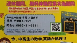 そこで、学習塾イノセント人吉教室では、5/6(土)16:50~19:20で数学と理科の入試チャレンジを実施します!