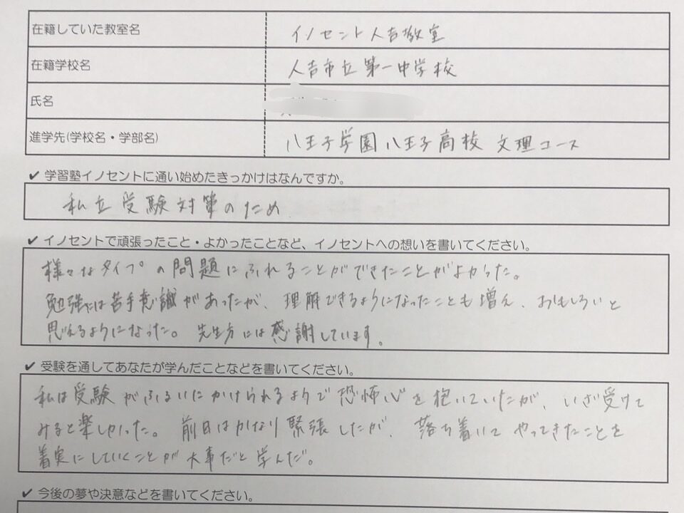 熊本県 人吉教室から八王子学園に合格!~合格体験記~ 事務イノセント 2024年3月27日 人吉第一中から八王子高文理に合格! 私立受験で且つ県外の八王子高受験のために通ってくれましたが、独自のネットワークで対策も万全に出来、見事合格まで勝ち取ってくれました! 本当におめでとう!