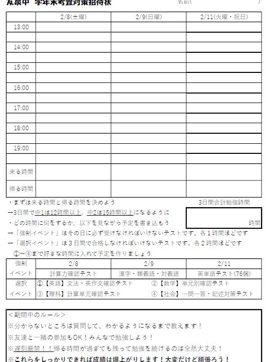 定期テスト 友泉中の生徒さんへ「本気の対策会」をお知らせします 永野 佑希 2025年2月1日 こんにちは!田島教室の永野です。 今回は友泉中の生徒さんに向けて定期考査対策のお知らせです。 <イノセント田島教室 定期考査対策会> 日程:2/8(土)、2/9(日)、2/11(火・祝)の3日間 時間:13:00~20:00のうち、中1は4時間以上、中2は5時間以上 場所:イノセント田島教室 費用:無料 塾生はもちろん全員参加ですが、友人を誘ってもOKの対策会なので、塾生ではない生徒さんも「イノセントでの勉強ってこういうのなんだ~」と感じながら、テストに向けて頑張るのにお使いいただけます。 対策会のこの3日間では以下の勉強を予定しています。 【英語】 ・試験範囲の英単語確認テスト ・文法、英作文対策 【数学】 ・計算問題対策テスト ・単元別まとめテスト 【国語】 ・漢字、文法問題対策 【理科】 ・計算単元確認テスト 【社会】 ・一問一答、記述対策テスト これだけの量をしっかりできれば成績が上がること間違いなしのボリュームです。もちろん生徒さんからの希望があれば教材を用意してきちんと分かるようにやらせます。定期考査は、今までの自分の「本気の勉強」を毎回更新してほしいと私は思っています。すごく大変ですが、イノセント田島教室は、2/13-14の学年末考査に向けて本気で努力をさせます!そして、成果が出ると自信がついて次の学年に上がることができます。イノセント田島教室の本気の対策に参加してみたい!もっと知りたい!という方はお気軽にお問い合わせください!大歓迎でお待ちしております。 イノセント田島教室住所:福岡市城南区田島4-17-3TEL:092-831-4506