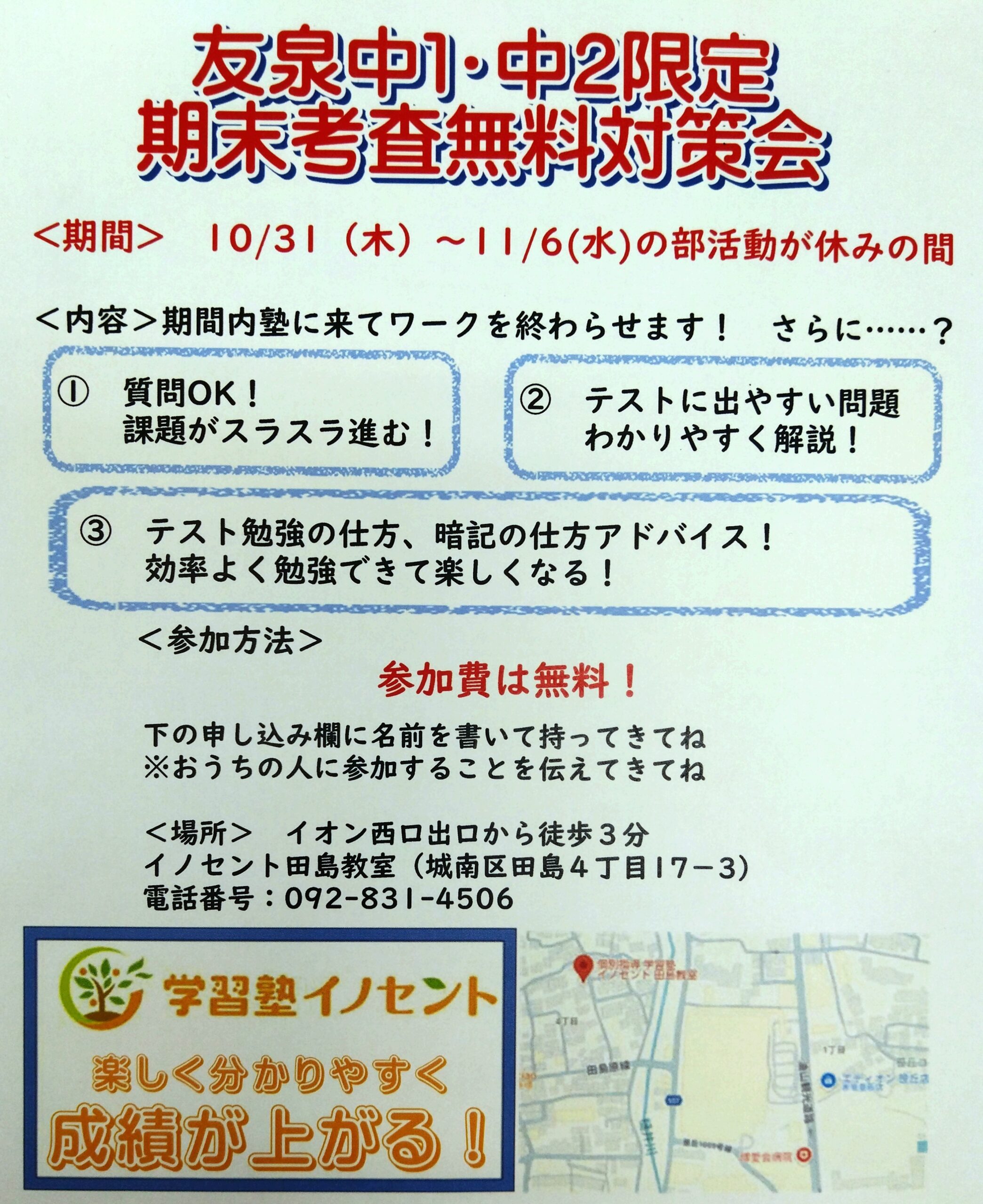 定期テスト 期末考査対策実施のお知らせ 永野 佑希 2024年10月28日 / 2024年10月30日 こんにちは!田島教室です。田島教室最寄りの友泉中学校では、11/7-11/8で期末考査が行われます。そこで田島教室では、 友泉中1・中2限定で定期考査対策を実施します。 <期間>10/31~11/6の参加可能な日 <時間>平日18:00~20:00 土日祝13:00~20:00のうち、自分で決めた時間! <内容>①ワーク勉強会→質問はもちろん自由、苦手科目もスラスラ進む! ②「今何をすればいい? これで勉強大丈夫かな……?」をなくそう!→教室長がしっかりチェック! 勉強の仕方もアドバイスします! 効率よく、集中して勉強できる環境で、周りと差をつけよう! 現在参加者募集中です! 参加希望者は、教室までご連絡をお願いします!