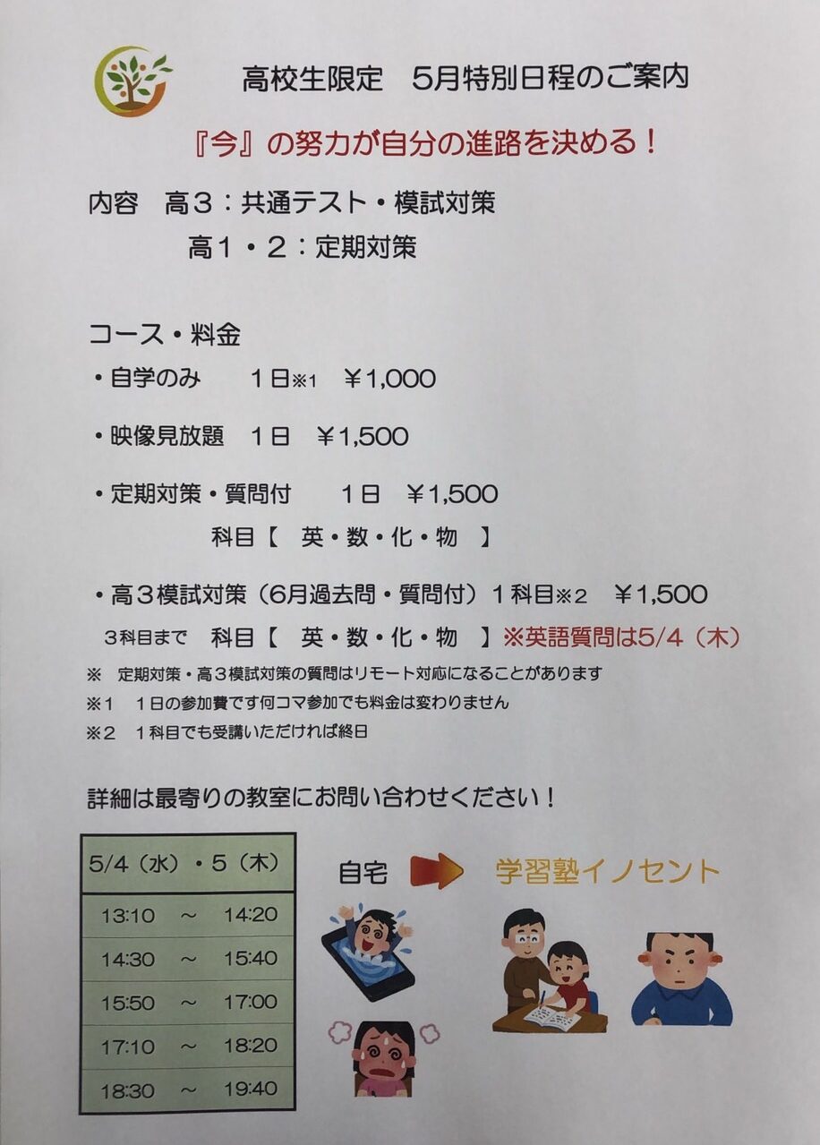 人吉教室 高校生対象 ゴールデンウィーク特別勉強会のお知らせ 事務イノセント 2022年4月29日 高校生の皆さんこんにちは!新学期が始まり、1ヶ月が経ちましたが生活のリズムは作れていますか?5月には体育祭、部活している人は、合宿・高体連・高文連の大会、そして中間テスト・・・とまさにイベント目白押しですね! 学習塾イノセントでは、高3生には6月の共通テスト模試対策、高1・2生には定期考査対策の特別勉強会を設定しています! 内容・日程は下記のようになっております。