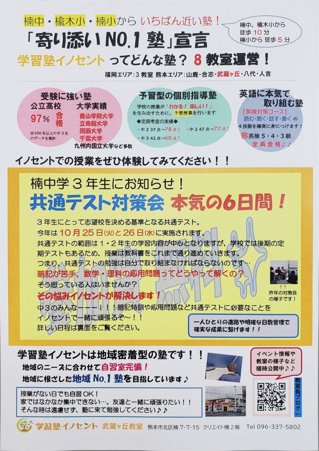 学習塾イノセント武蔵ヶ丘教室の生田です。