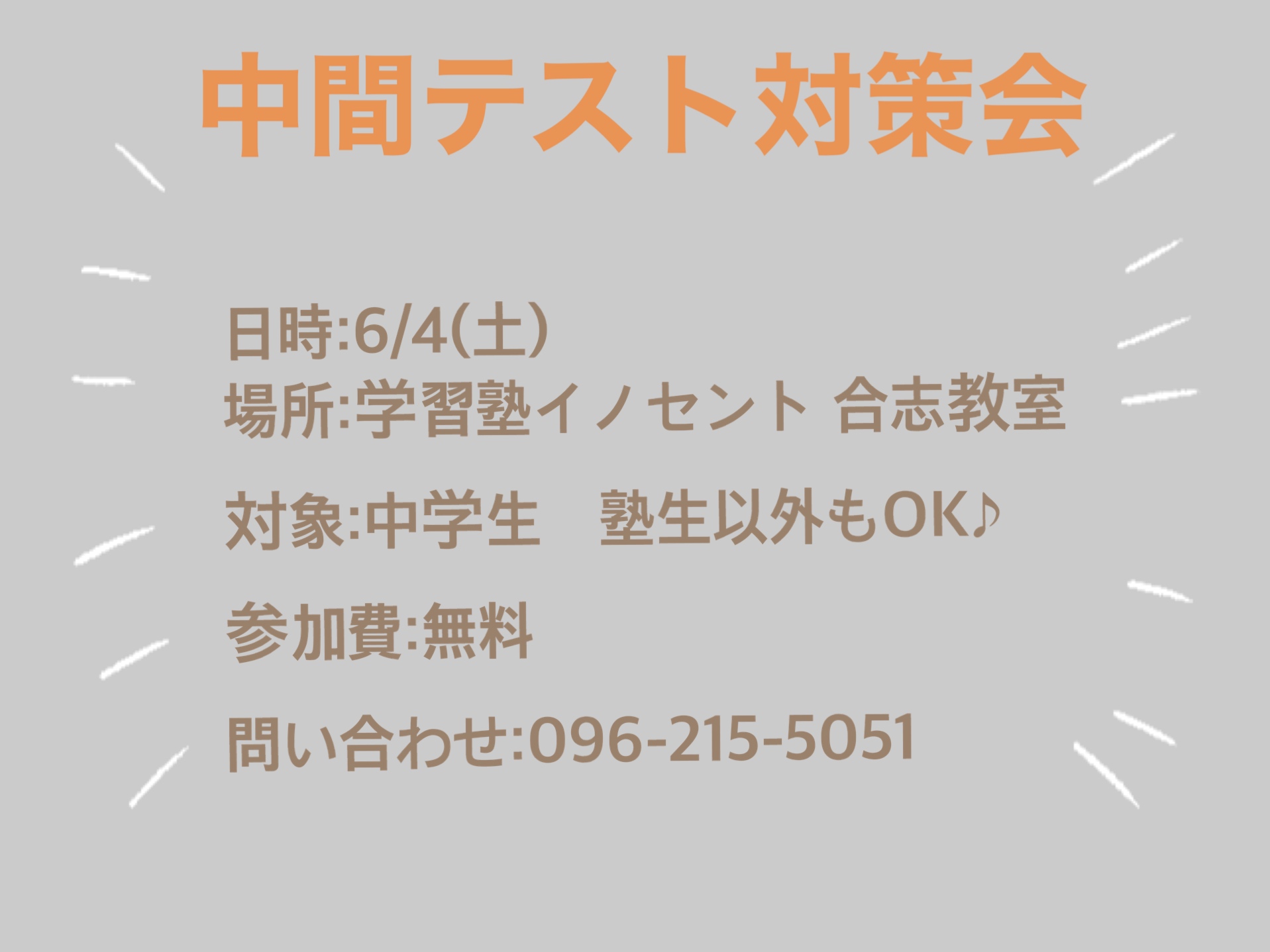 もうすぐ前期の中間テストがやってきますね。合志中・楓の森中・泗水中などの生徒さんは中間テストまで1ヶ月をきってます!
