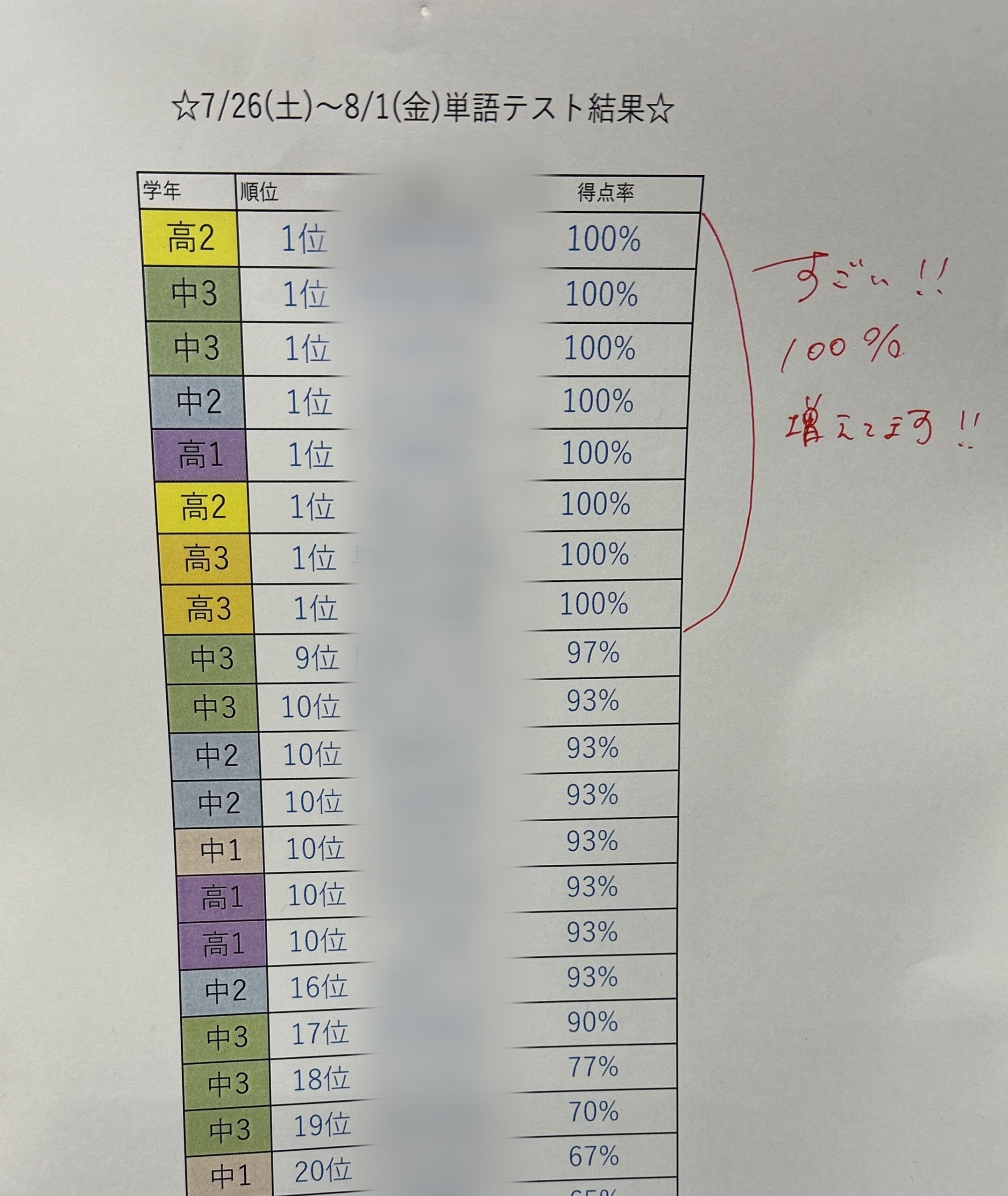 通ってくれている生徒の小6(漢字)~高3までのランキングにしているので