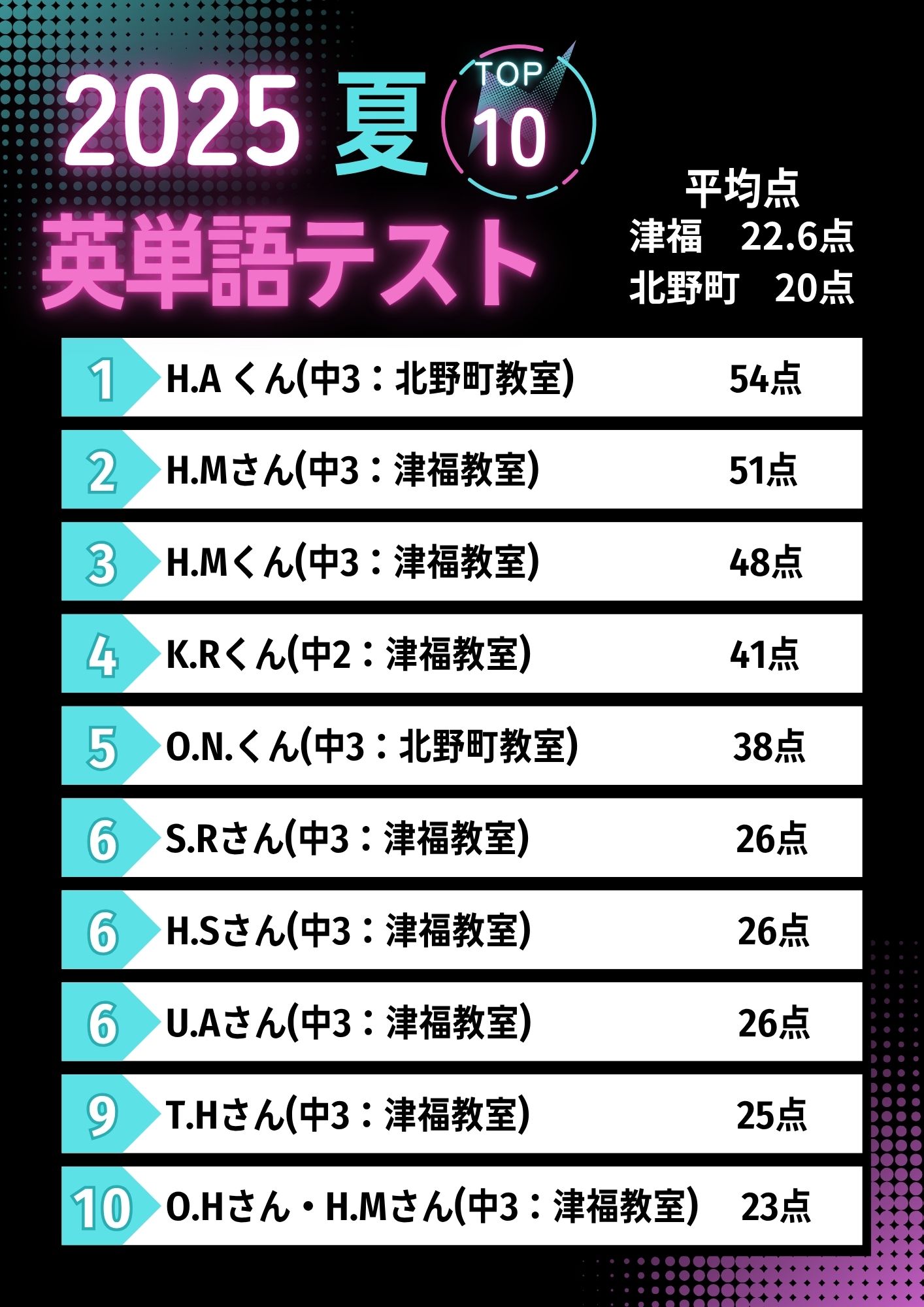 またまた遅くなりましたが, 津福教室に通ってくれている中高生の1学期定期テスト(前期)の結果を報告します。